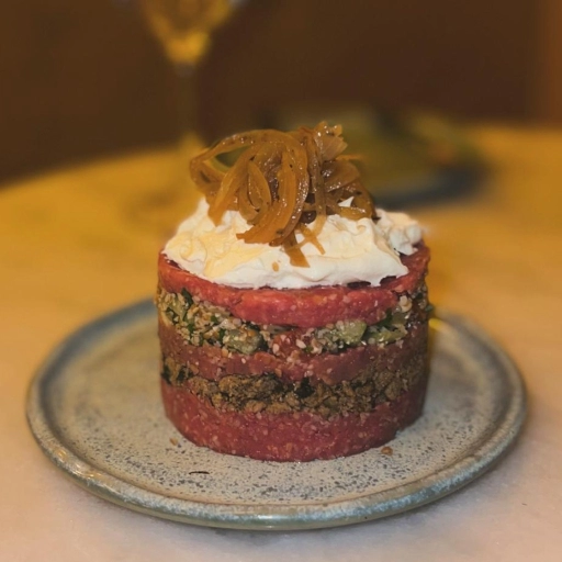 Camada de kibe cru temperado, recheio de kibe assado, tabule, coalhada e cebola caramelizada. Uma explosão de sabores e... Ver completo